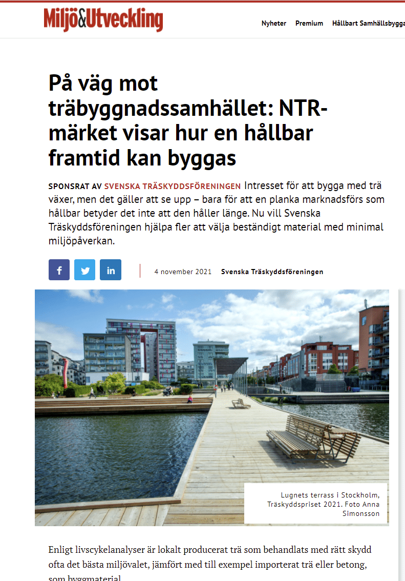 Under rubriken På väg mot träbyggnadssamhället: NTR-märket visar hur en hållbar framtid kan byggas beskrivs Träskyddsföreningens verksamhet inom hållbarhetsområdet. Det är viktigt och bra att fler får ta del av infomation om det arbete och de framsteg som träskyddsbranschen gör på hållbarhetsområdet.
