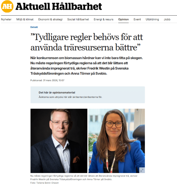 Träskyddsföreningens VD Fredrik Westin och Anna Törner från Svebio lyfter i Aktuell Hållbarhet behovet av tydligare regelverk för att bättre ta till vara träresurser.